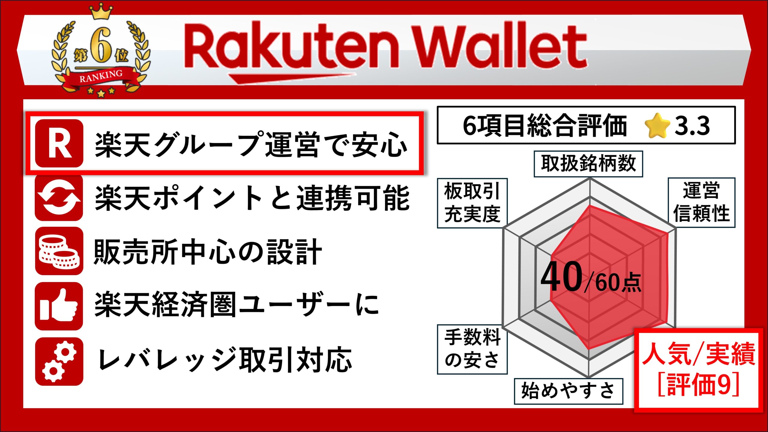 大手楽天グループ運営による高い信頼性が最大の強みで、信託保全による顧客資産の保護体制も整備。ハッキング被害ゼロの運営実績で、セキュリティ面でも安心です。アプリはGoogle Playで10万ダウンロード超、App Storeで約1万件のレビューを誇り、レビュー評価も良好です。