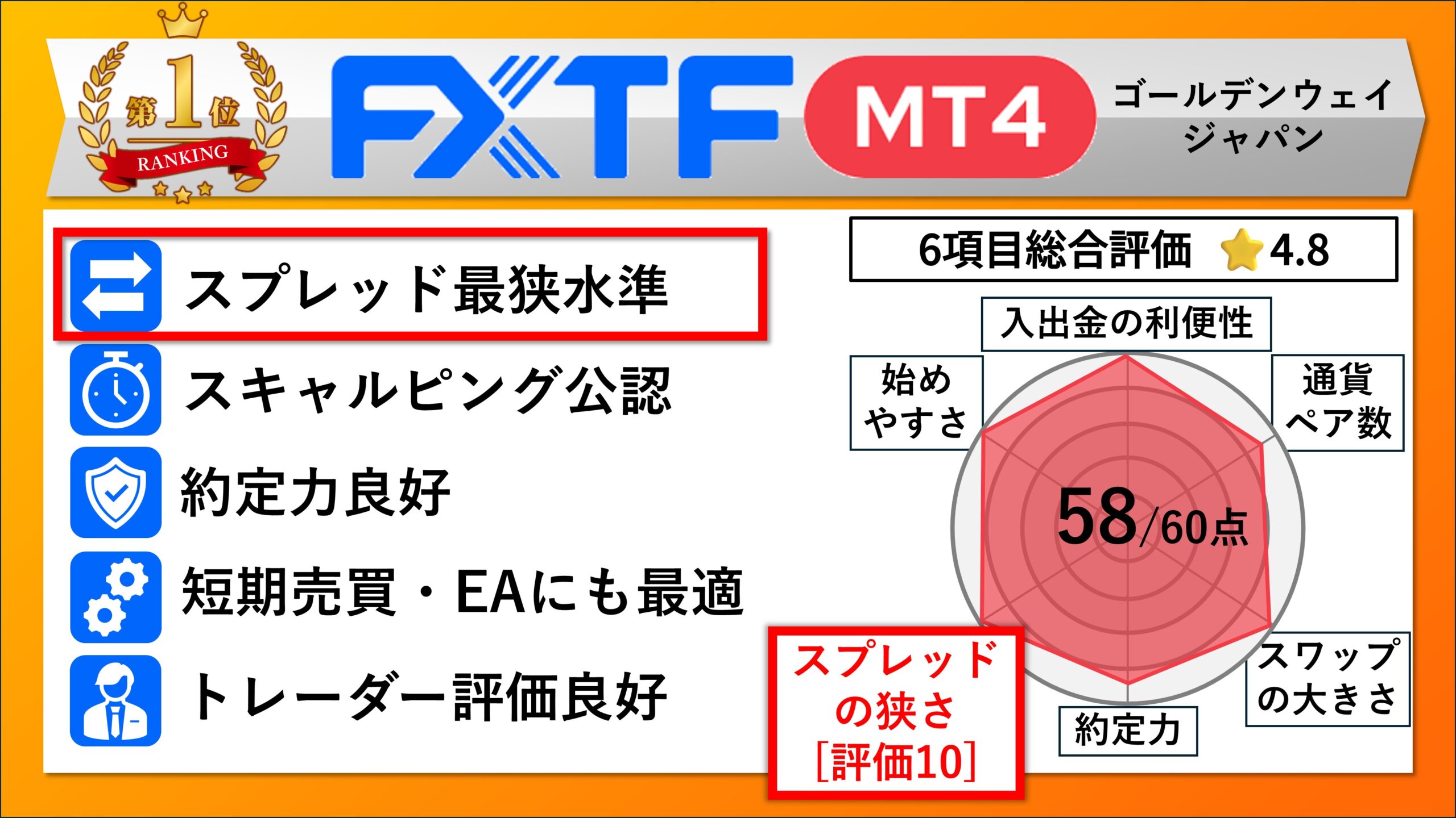1位【ゴールデンウェイ・ジャパン FXTF MT4】(スプレッドの狭さ評価:10/10)