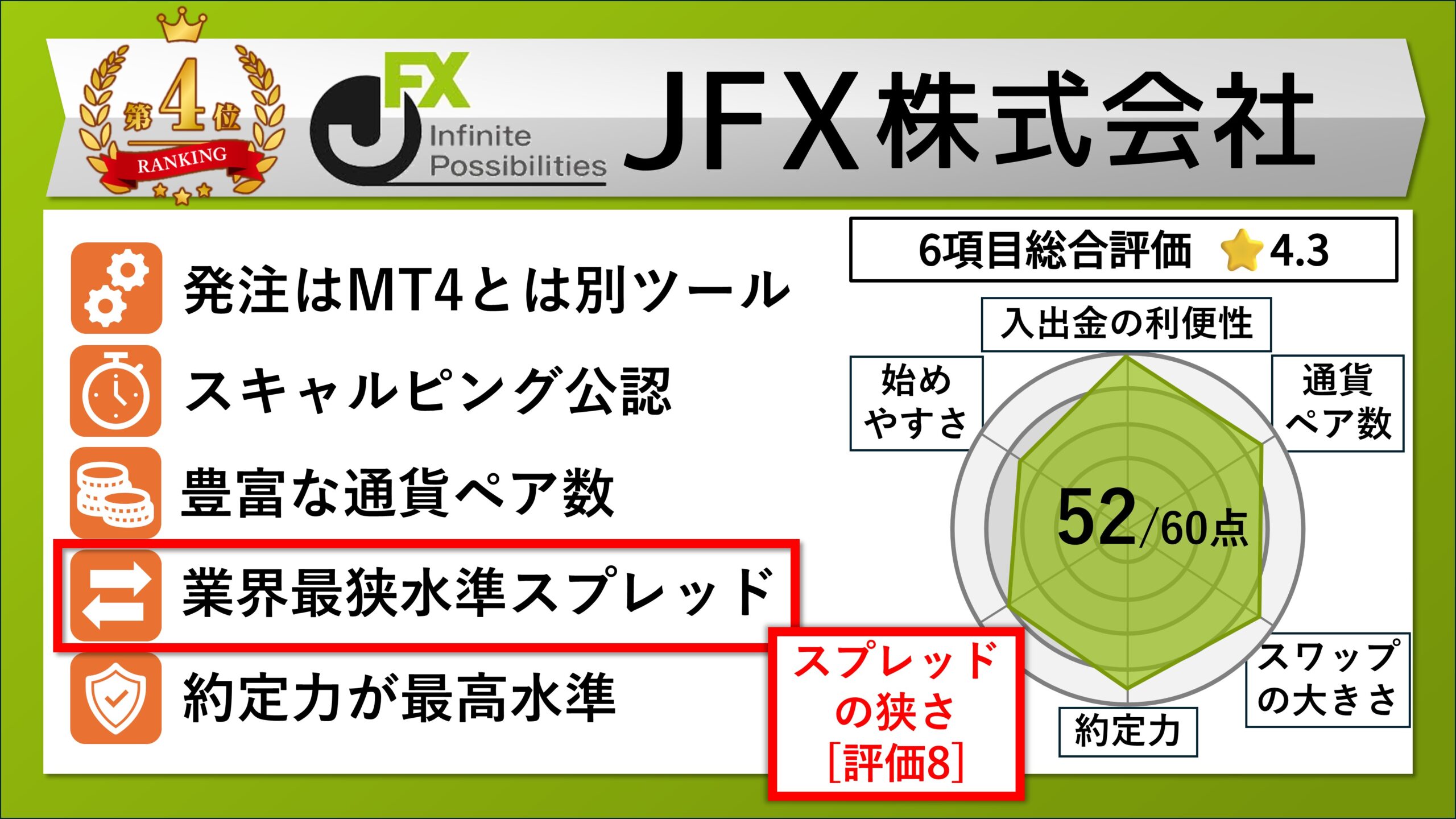 4位【JFX MT4】(スプレッドの狭さ評価:8/10)