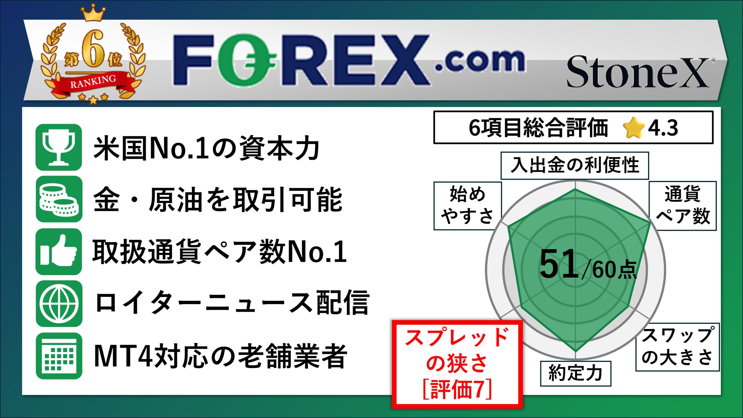 6位【StoneX証券 FOREX.com MT4】(スプレッドの狭さ評価:7/10)