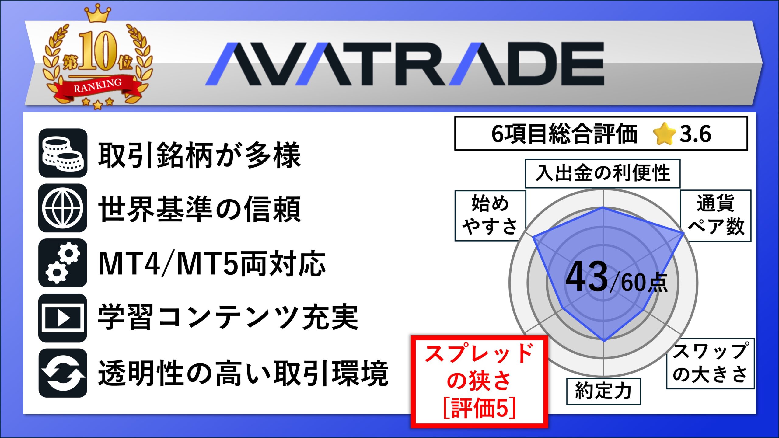 10位【アヴァトレード・ジャパン MT4】(スプレッドの狭さ評価:5/10)